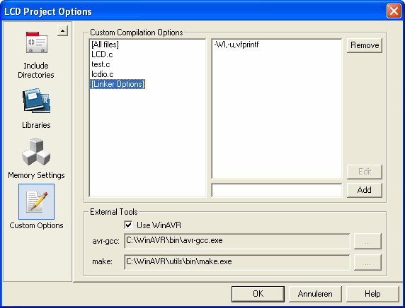 Je moet eerst op de knop Custom Options klikken (links), vervolgens [Linker Options] selecteren en dan in het veld naast de Add knop intypen: