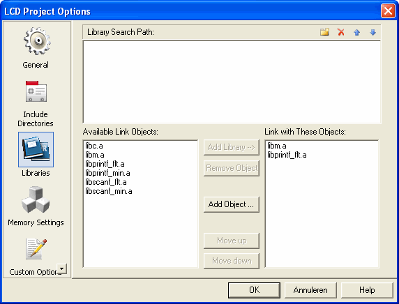 Om math functies te kunnen gebruiken moet libm.a meegelinkt worden. Om floating