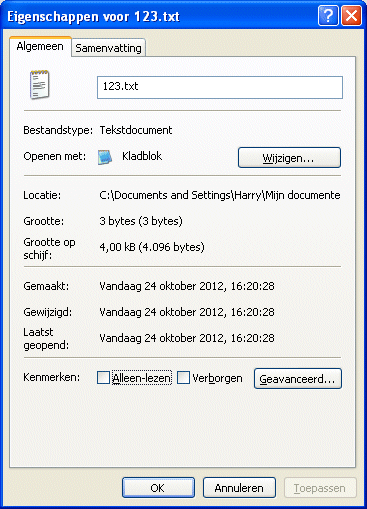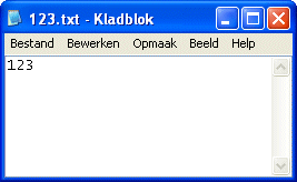 In het directory waar de executable file is uitgevoerd is nu de file 123.txt aangemaakt. In de filebrowser kunnen de "eigenschappen" van deze file bekeken worden. De file blijkt 3 bytes groot te zijn. Deze file kan met notepad worden bekeken: