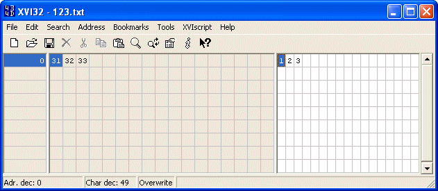 In het deel met de grijze achtergrond zien we de hex codes van de bytes uit de file. In het deel met de witte achtergrond zien we de bijbehorende ASCII karakters. Het is nu duidelijk te zien dat de file bestaat uit 3 bytes. Er is geen end-of-file karakter! De drie bytes bevatten de ASCII codes voor karakter 1, karakter 2 en karakter 3.