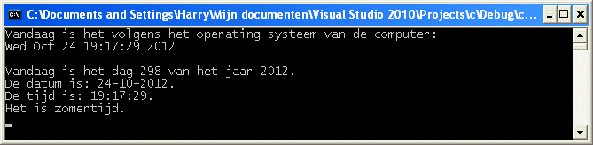 #include <stdio.h>#include <time.h>int main(void) {time_t tijd;struct tm* pt;/* De tijd en datum ophalen uit het operating systeem */time(&tijd);if (tijd != -1) {/* De tijd en datum afdrukken zonder het gebruik van de structuur tm */printf("Vandaag is het volgens het operating systeem van de computer:\n%s\n", ctime(&tijd));/* De tijd en datum omzetten naar de structuur tm*/pt = localtime(&tijd);/* De tijd en datum afdrukken met de structuur tm */printf("Vandaag is het dag %d van het jaar %d.\n", pt->tm_yday + 1, pt->tm_year + 1900);printf("De datum is: %02d-%02d-%4d.\n", pt->tm_mday, pt->tm_mon + 1, pt->tm_year + 1900);printf("De tijd is: %02d:%02d:%02d.\n", pt->tm_hour, pt->tm_min, pt->tm_sec);if (pt->tm_isdst >= 0) {printf("Het is ");if (pt->tm_isdst == 0) {printf("wintertijd.\n");}else {printf("zomertijd.\n");}}}else {printf("Datum en tijd zijn niet beschikbaar op dit systeem.\n");}getchar();return 0;}